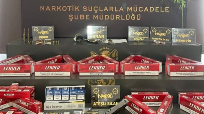 Yapılan aramalarda 4 parça halinde toplam ağırlığı 22,56 gram esrar maddesi, 1 parça halinde toplam ağırlığı 1,24 gram sentetik cannobinoid (bonzai) maddesi, 1 kök Hint keneviri, 10 adet sentetik ecza hapı, 272 paket gümrük kaçağı sigara, 1 adet kurusıkı tabanca ve 65 adet fişek ele geçirildi.