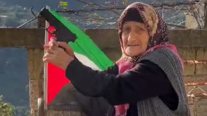 Arkasına Filistin bayrağı asan Emine Nine, eline silahı alarak “Çocukları kıran, öldüren İsrail Allah senin canını alsın. İsrail Allah seni yok etsin.” sözleriyle havaya ateş etti.