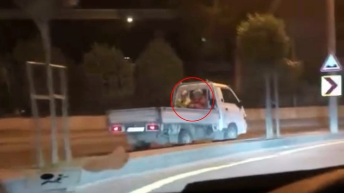 Öte yandan, ters şeride giren kamyonet sürücüsünün kural tanımazlığının yanı sıra, aracın açık kasasında hiçbir güvenlik önlemi olmadan yolculuk eden iki kişi de dikkat çekti.