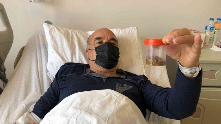 69 yaşındaki Samet Saraç’ın böbreğinden, ‘Perkütan Nefrolitotomi’ tekniği ile sırtında açılan 1 santimetrelik delik aracılığıyla, 200 gram ağırlığında 1.200 adet taş çıkarıldı.