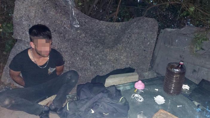 Etrafı çalılıklarla çevrilerek gizlenmeye çalışan alanda A.D. isimli bir şahıs yerde oturur vaziyette, yanında da uyuşturucu maddelerle yakalandı.