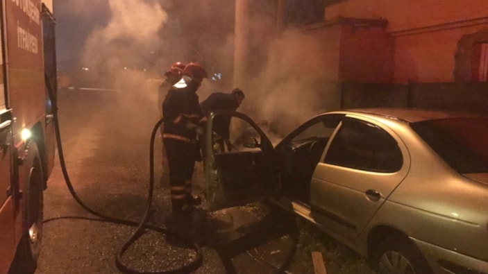 Otomobildeki yangın söndürülürken, polis ekipleri olay yerinde inceleme yaptı.