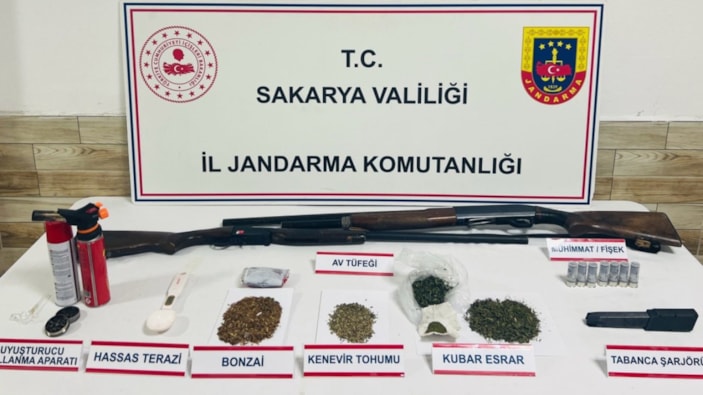 Adreslerde yapılan aramalarda; 465 gram sentetik uyuşturucu, 310 gram kubar esrar, 40 gram kenevir tohumu, uyuşturucu kullanma aparatı, hassas terazi, öğütme aparatı, 7 fişek, 2 ruhsatsız av tüfeği ve tabanca şarjörü ele geçirildi.
