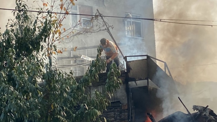 Ekiplerin yangın bölgesine intikalinden önce, deponun bulunduğu evin sahibi kova ile taşıdığı suyu dökerek yangını söndürmeye çabaladı.