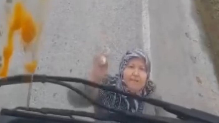 Evin yakınına tırını park eden şoföre öfkelenen yaşlı kadın, eline aldığı yumurtaları cama fırlattı. Tır şoförü ise yaşanan olayı şaşkınlıkla kayda aldı.