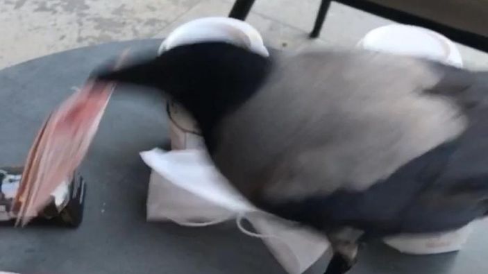 Akabinde yanlarına kadar gelen karga masada duran 40 TL miktarındaki parayı alarak uçtu.