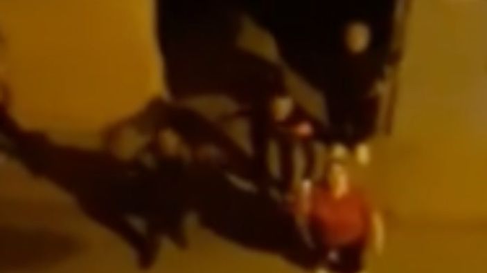 Kadınlı erkekli grup, hararetli şekilde balkondaki komşularına bağırırken evi taşlamaya başladı.