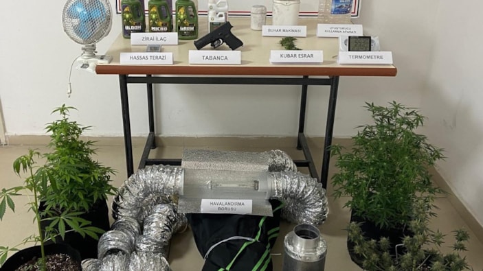 Yapılan aramalarda; 1 adet iklimlendirme sistemi, 4 kök kenevir bitkisi, 13 gram kubar esrar, 1 adet ruhsatsız tabanca, 1 adet uyuşturucu kullanma aparatı, 1 adet hassas terazi, 18 adet 7,65 mm çapında fişek ve 6 litre sıvı gübre ele geçirildi.