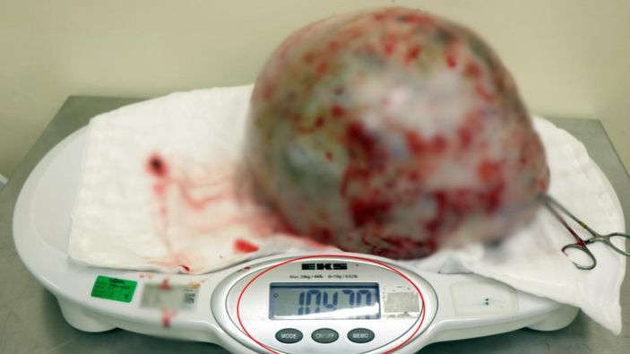 Karnındaki şişlikten kurtulmak için hastaneye başvuran 29 yaşındaki Nino Epimkova’nın karnından, 10 kilo 470 gram kitle çıkarıldı.