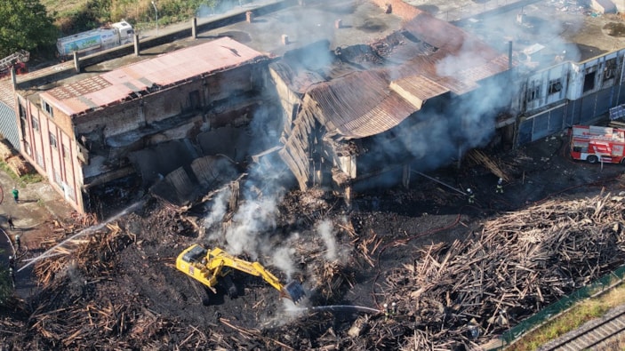 İş makineleri, arazözler ve itfaiye araçlarıyla fabrika içerisindeki kerestelerde bugün de soğutma işlemleri devam ediyor.