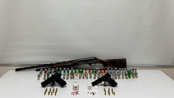 Şahsın ikametinde yapılan aramada 1 adet ruhsatsız tabanca, 1 adet faturasız kurusıkı tabanca, 1 adet ruhsatsız av tüfeği, 21 adet 9x19 mm çapında tabanca mermisi, 69 adet dolu av tüfeği kartuşu ve 61 adet sentetik ecza uyuşturucu hap ele geçirildi.