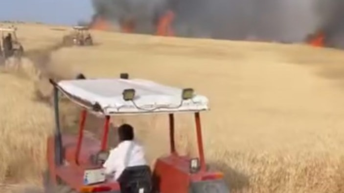 Viranşehir ilçesinde çıkan yangında 170 dönüm buğday tarlası zarar gördü. Köylülerin müdahalesiyle kontrol altına alınan yangında panik anları cep telefonuna yansıdı.