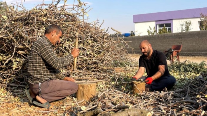 Şanlıurfa'nın Suruç ilçesi kırsalında yaşayan vatandaşlar, sonbaharda hasat edilen fıstık dallarını toplayarak, kışın yakacak olarak değerlendirmek için kesiyor.