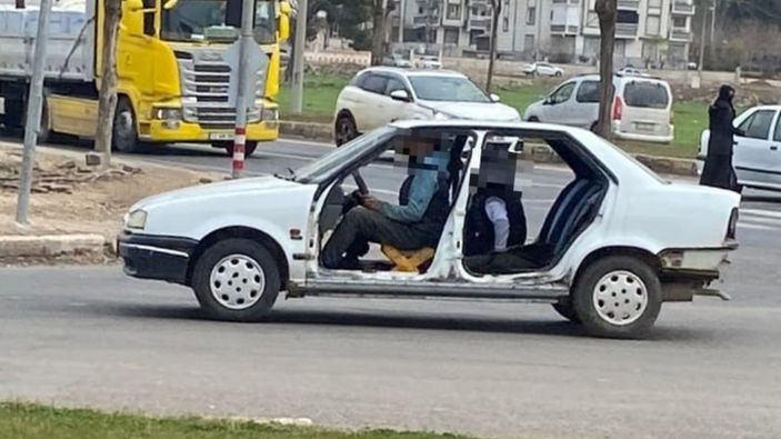 Şanlıurfa'da kapıları ve koltukları olmayan otomobilde yolculuk hayretler içerisinde bıraktı. İskemlede oturan sürücü hiçbir tehlikeye aldırış etmeden otomobili sürmeye devam etti.