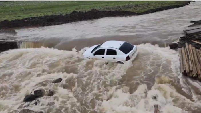 Siverek-Karacadağ bölgesinde taşan köprüden karşı tarafa geçmeye çalışan bir otomobil, suya kapılarak dereye sürüklendi. Otomobilde bulunanlar çevredeki vatandaşların yardımıyla kurtulurken otomobil, sel suları arasında mahsur kaldı.