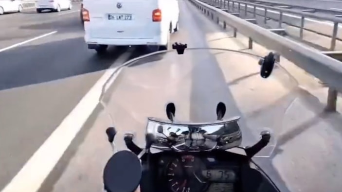 Bir motosiklet sürücüsü, köprü yolundaki emniyet şeridinde 100 km'nin üzerinde hızla ilerlemeye başladı.