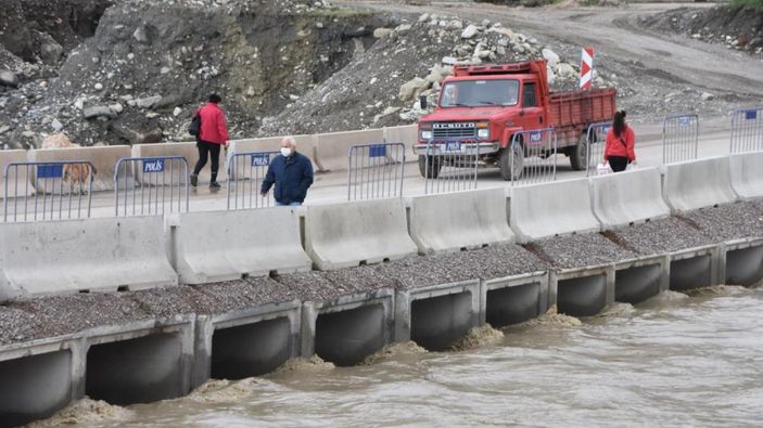 Çayda yükselen su seviyesi, köprünün yarısına ulaştı.