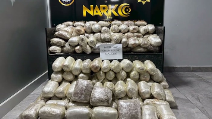 Yapılan aramada, aracın bagaj kısmında 119 parça halinde toplam 86 kilo 600 gram skunk uyuşturucu maddesi ele geçirildi.