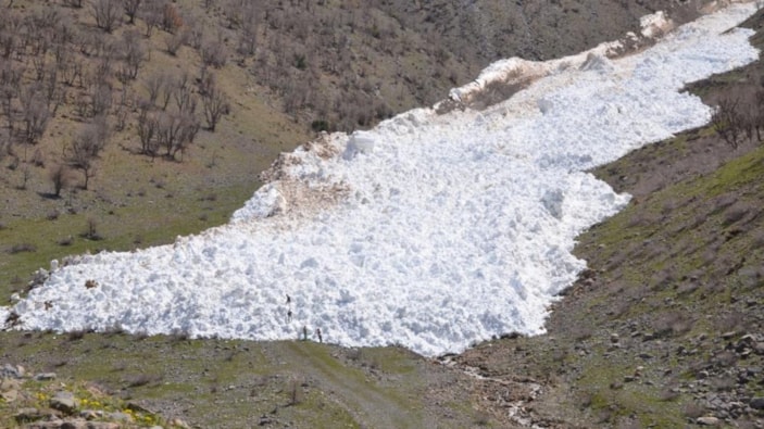 Şırnak'ın Uludere ilçesine bağlı Ortaköy'de sıcak havaların etkisiyle yüksek dağ yamacından kopan kar kütleleri çığın oluşmasına neden oldu.