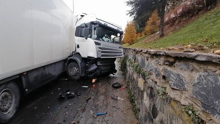 Tır sürücüsü, yerlerin kaygan olması nedeniyle aracın kaydığını ve kontrolü sağlayamayarak istinat duvarına çarptığını söyledi.