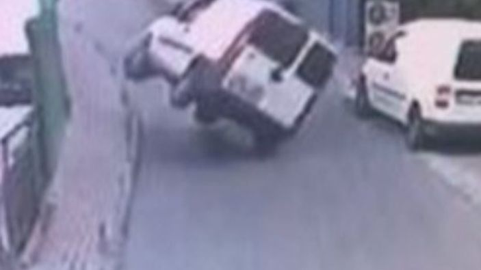 Dönüş yapacağı sırada kaldırıma çarpıp devrilen aracın o anları, güvenlik kamerasına yansıdı.
