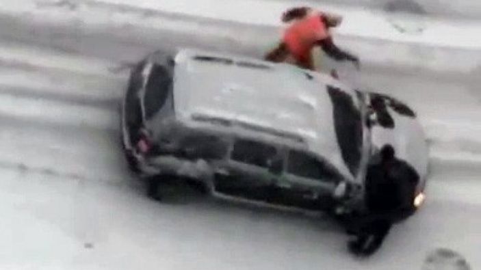 Yoğun kar yağışının ardından, yokuşta kayan aracı durdurmak isteyen 2 kişi, aracın önüne geçerek kaymayı engellemeye çalıştı.