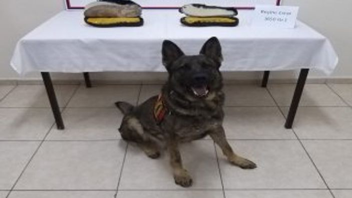 Jandarma tarafından yapılan yol kontrolleri sırasında narkotik köpeği ‘Geçim’ ayakkabı tabanında zulalanmış 650 gram reçine esrar buldu.