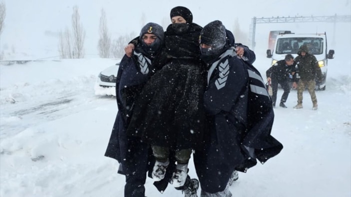 Jandarma ekipleri, kara saplanan araçları çıkarmak için küreklerle kar temizliği yaparken, arıza yapan araç sahiplerine de destek sağladı. Ekiplerin yardımları sadece araçlarla sınırlı kalmadı; yürümekte zorlanan yaşlı bir kadını, Gürün İlçe Jandarma Komutanlığından iki asker kucaklarına alarak güvenli bir şekilde jandarma aracına taşıdı. Bu örnek davranış, zor koşullarda dayanışmanın ve insanlığın en güzel örneği olarak hafızalara kazındı.