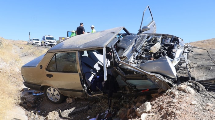 Toprak zemine çarpan otomobil, parçalanarak kullanılamaz hale geldi. Kazanın şiddeti, aracın parçalanmış görüntüsüyle dikkat çekti.