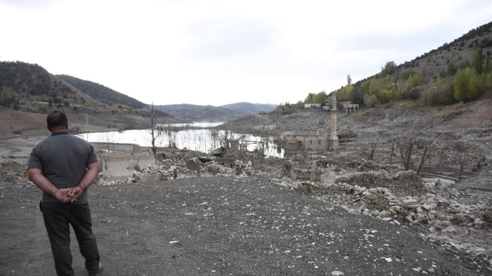 2008 yılında su tutmaya başlayan Pusat Özen Barajı’nın altında kalan Pusat köyünün taşındığı dönemde çalışan Ramazan Karagöz, yıllar sonra yeniden bölgeyi ziyaret ederek kalıntılar arasında gezinti yaptı.