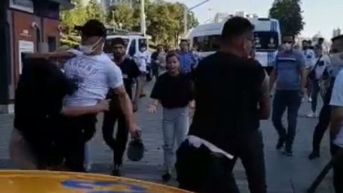 Çıkan kavgada bir İBB zabıtası bir şahsı tartaklarken, başka bir zabıta bir kadına uçan tekme attı.