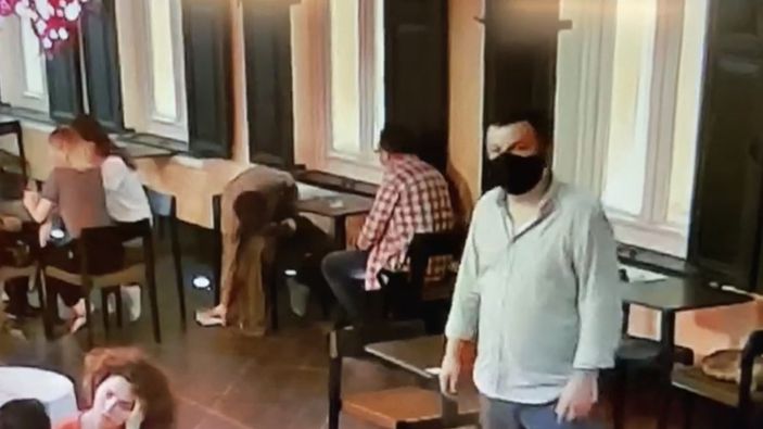 O esnada kızın yan tarafındaki masada oturan cerrahi maske takan bir şahıs, arkadaşıyla konuşuyormuş gibi yaparak genç kızın çantasını yere düşürdü.