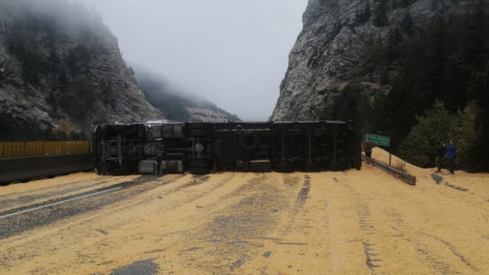 Sürücüsü öğrenilemeyen tahıl yüklü tır, Tarsus-Ankara Otoyolu'nun Gülek Boğazı mevkiinde devrildi.