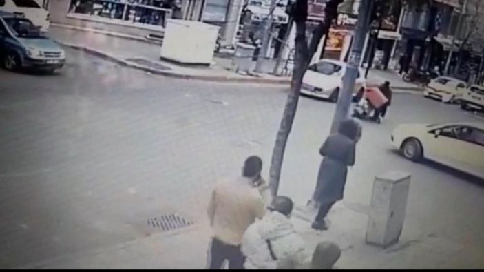 Bu sırada kurye M.K., motosikletine binerek hızla olay yerinden kaçtı. Kaza anı ise bir iş yerinin güvenlik kamerası tarafından saniye saniye görüntülendi.