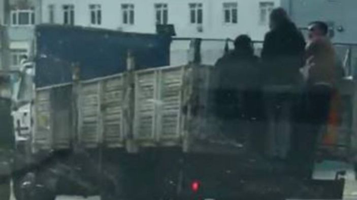 Tekirdağ'da 3 kişinin yan yana kamyonet kasasında yaptığı yolculuk görenleri tedirgin ederken, trafiğe de tehlikeye soktu. O anlar cep telefonu kamerasına yansıdı.