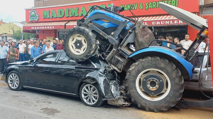 Tokat'ta trafik kazası: Traktör otomobilin üstüne çıktı