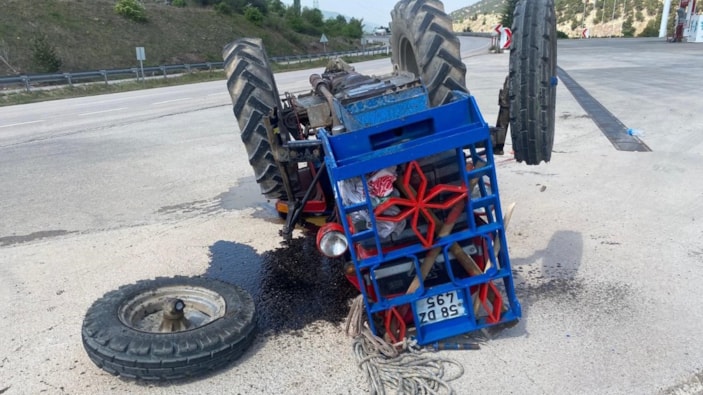 Tokat'ın Reşadiye ilçesine bağlı D-100 karayolunda 49 yaşındaki A.Ö. idaresindeki traktör, Koyulhisar istikametinden Reşadiye istikametine seyir halindeyken yol kenarındaki bir akaryakıt istasyonuna girmek isteyen sürücünün direksiyon hakimiyetini kaybetmesi sonucu devrilerek takla attı.