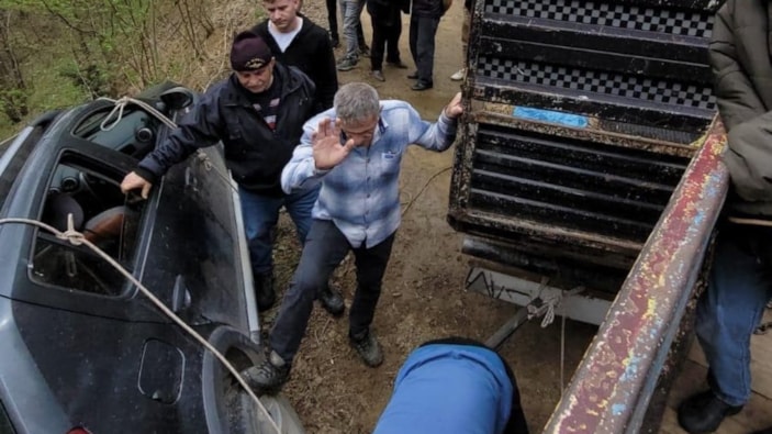 Araklı ilçesinde uçurumda mahsur kalan araç mahalle sakinlerinin yardımıyla kurtarıldı.