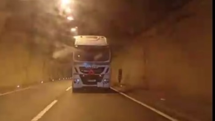 Trabzon'un Araklı ilçesinde bulunan Kalecik mahallesindeki Araklı Tüneli'ne girişinde seyir halinde giden bir arabadaki sürücü önünde bir tırın geri geri gittiğini görünce şaşkınlığını gizleyemedi.