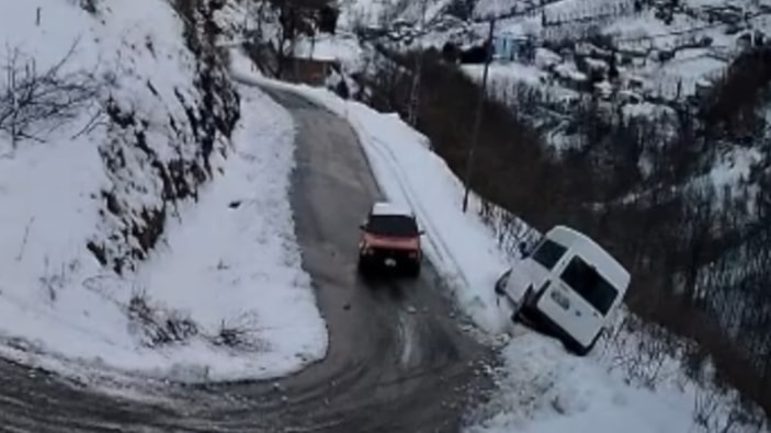 Trabzon'da keskin ve karlı virajda sürücüsünün direksiyon hakimiyetini kaybettiği minibüsün uçuruma yuvarlandığı kaza güvenlik kamerasına yansıdı.