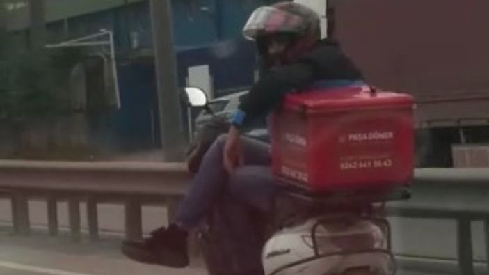 Sürücü, hem kendini hem trafikteki diğer sürücüleri tehlikeye atarak rahat bir şekilde yolculuk yapan motosikletli kuryeye, “Toparla kendini.” diyerek tepki gösterdi.