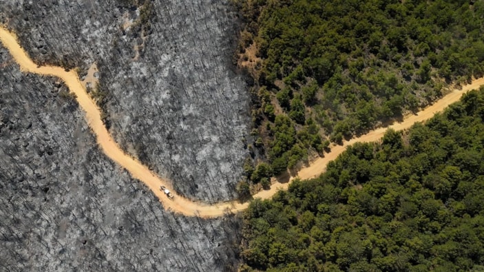 Büyük bölümü kızılçam ormanı olan yanan alanlar, drone'la görüntülendi.