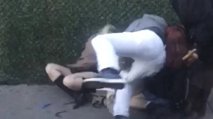 Bir diğer yandan elinde baston olan bir kişi, kadınları ayırmaya çalışırken yere düştü.