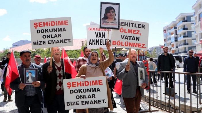 Aileler, bina önüne kadar "Kahrolsun PKK, iş birlikçi HDP", "Şehitler ölmez vatan bölünmez" sloganları attı.