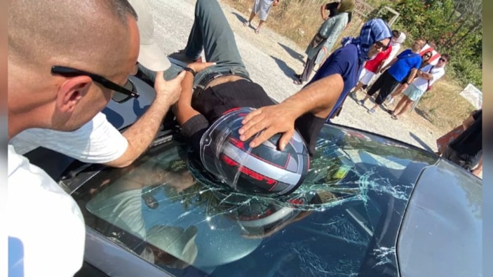 Çınarcık ilçesinde otomobilin arkadan çarptığı motosikletin sürücüsü, aracın ön camına düşerek yaralandı. Yaralı sürücü otomobilin üzerinde ambulans beklerken, o anlar cep telefonuyla görüntülendi.