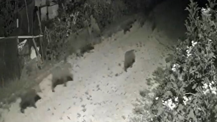 2’si yetişkin 11’i yavru olmak üzere toplam 13 yaban domuzundan oluşan sürü, güvenlik kameraları tarafından görüntülendi.