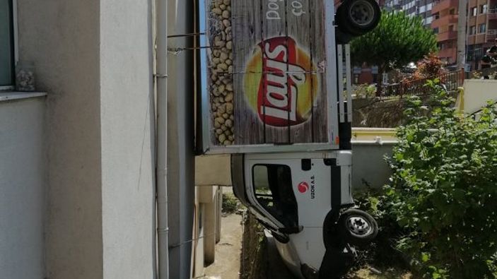 Zonguldak'ın Bahçelievler Mahallesi'ne bağlı Balkaya Caddesi'nde seyir halinde olan 06 DP 6649 plakalı kamyonet, bariyerlere çarparak 6 katlı apartmanın önündeki boşluğa düştü.
