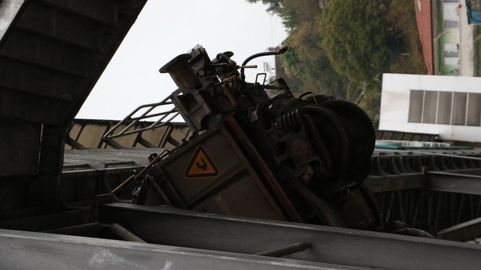 Zonguldak’ta, raydan çıkan vagon üst geçide saplandı VİDEO