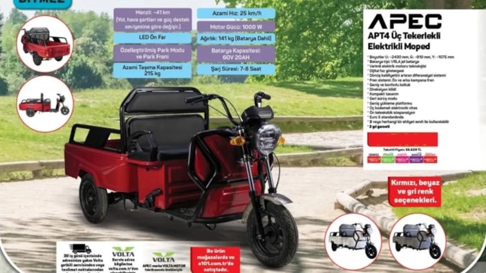 A101, yeni kampanyasında Volta’nın Türkiye’de ürettiği APEC APT4 elektrikli moped’i uygun fiyatla satışa sunuyor.