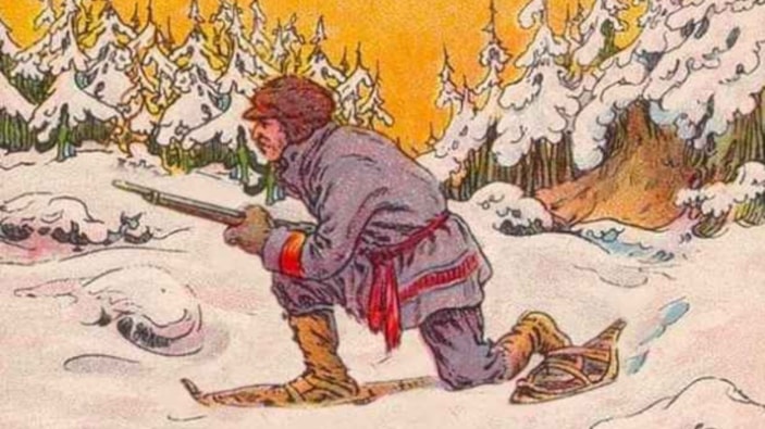 Paylaşılan görselde, elinde tüfek olan bir avcı, karla kaplı bir vadide çömelmiş halde görülüyor.